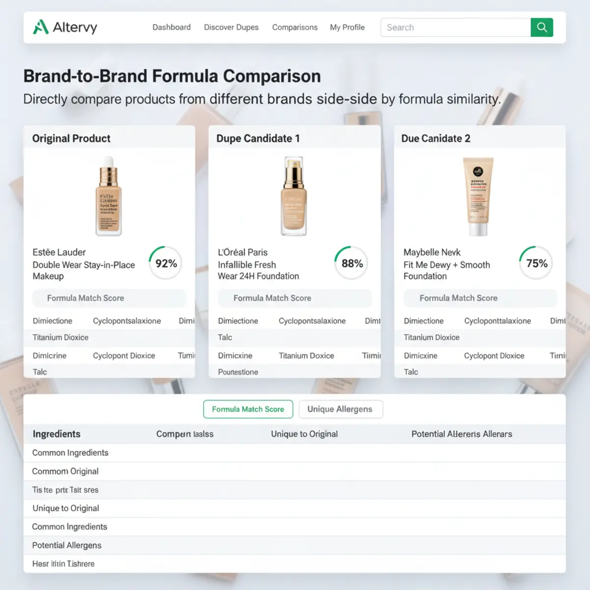 Altervy's core AI engine meticulously analyzes product ingredient lists and formula structures to identify deep similarities, going beyond surface-level ingredient overlap.